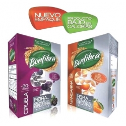 Bonfibra es un complemento alimenticio de fibra en gomas de gelatina con sabores a Mandarina y Ciruela, listas para consumir en cualquier momento del dia.